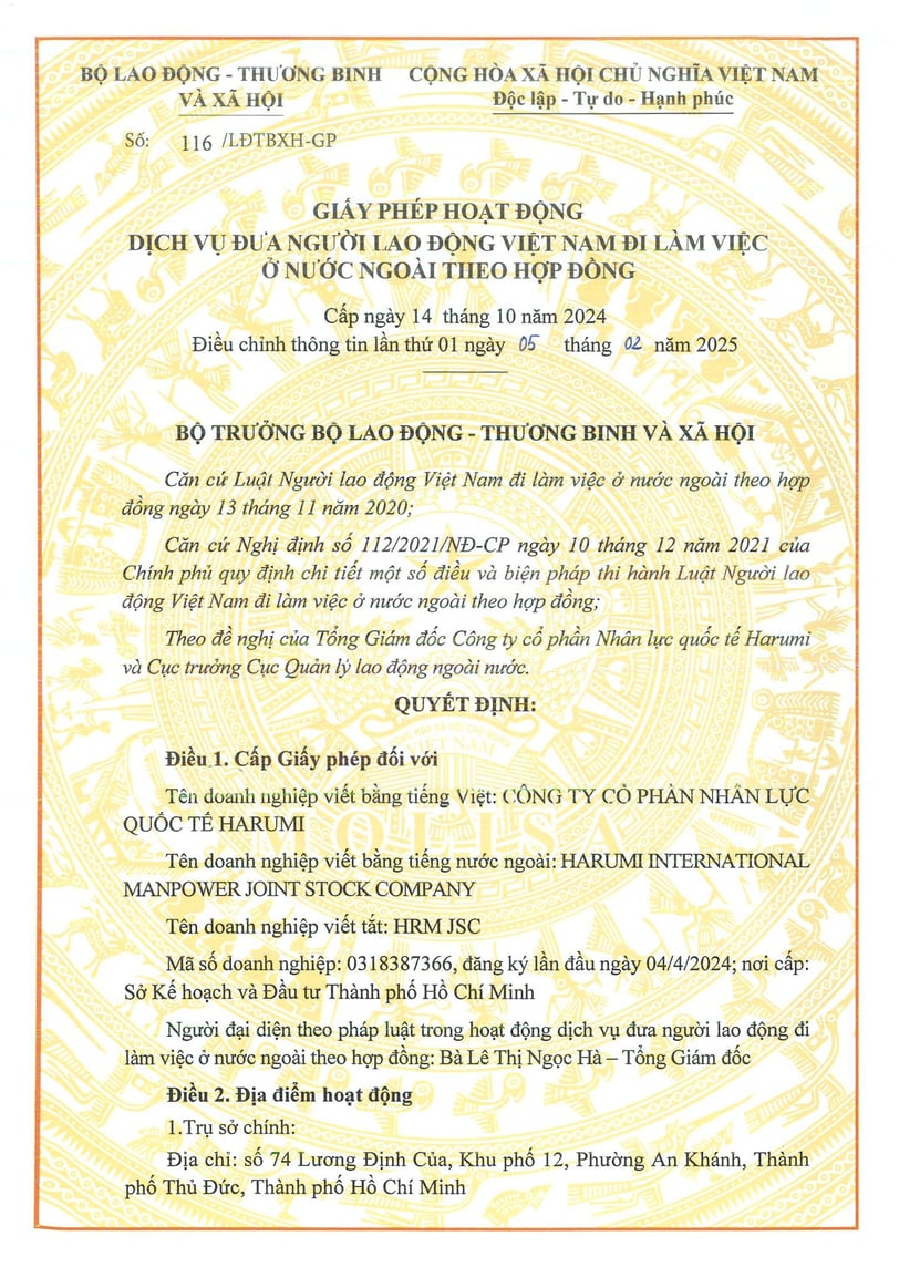 October 14, 2024, marks a significant milestone for Harumi International Manpower Joint Stock Company (HRMIM) as it has officially been granted a license by the Government of Vietnam to send workers abroad. This is not only a moment of joy and pride but also a strong motivation for HRMIM to continue fulfilling its mission of creating high-quality job opportunities, enhancing workers' skills, and improving the lives of Vietnamese laborers.