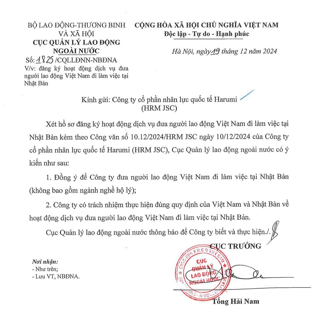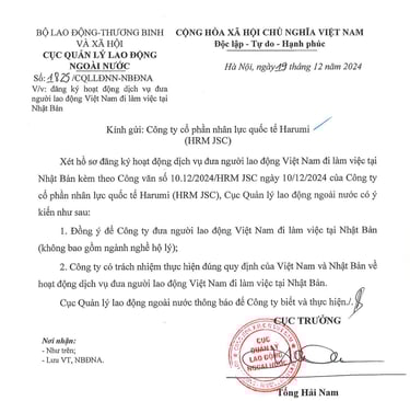 Harumi International Manpower Joint Stock Company (HRMIM) is delighted to announce that on December 19, 2024, the company was officially licensed by the Department of Overseas Labor Management to send Vietnamese workers to Japan. This marks a significant milestone, reaffirming HRMIM’s steady growth in the field of international workforce supply.