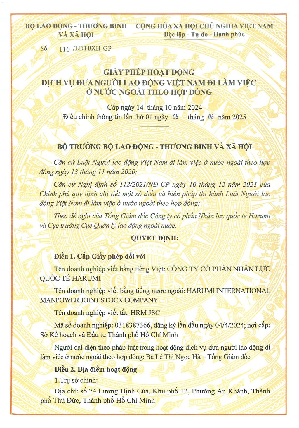 Ngày 14/10/2024 đánh dấu một cột mốc quan trọng đối với Công ty Cổ phần Nhân lực Quốc tế Harumi (HRMIM) khi chính thức được Chính phủ Việt Nam cấp Giấy phép hoạt động đưa người lao động đi làm việc ở nước ngoài. Đây không chỉ là niềm vui, niềm tự hào mà còn là động lực để HRMIM tiếp tục thực hiện sứ mệnh của mình trong việc tạo ra những cơ hội việc làm chất lượng, nâng cao tay nghề và cải thiện đời sống cho người lao động Việt Nam.